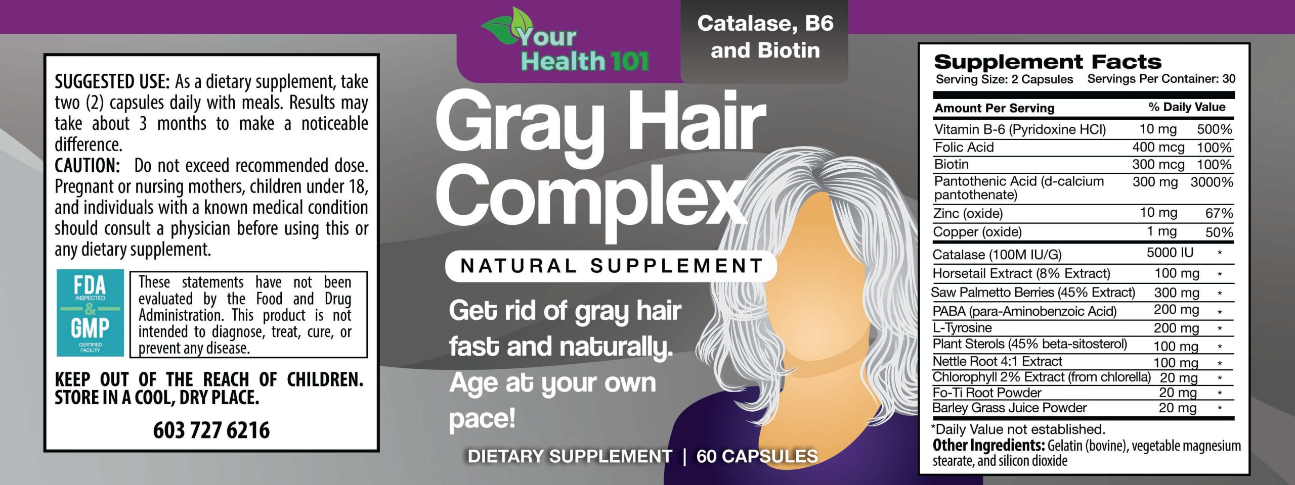 Gray Hair Complex (No More Gray) with Catalase, B6, and Biotin may naturally bring back the look you loved. Age at your own pace.