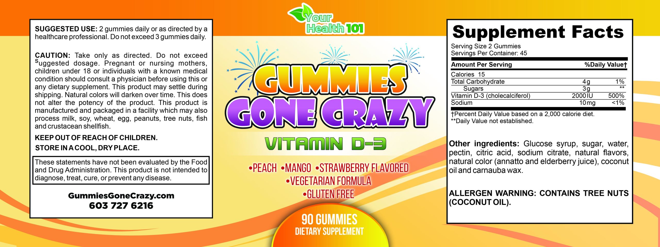 Gummies Gone Crazy Vitamin D3 is the perfect treat for those looking to boost their Vitamin D3 intake in a delicious way. Vitamin D3 is essential for the absorption of calcium, which is necessary for strong bones and teeth. By adding these gummies into your daily routine, you can help prevent calcium deficiency and other conditions associated with a lack of Vitamin D.